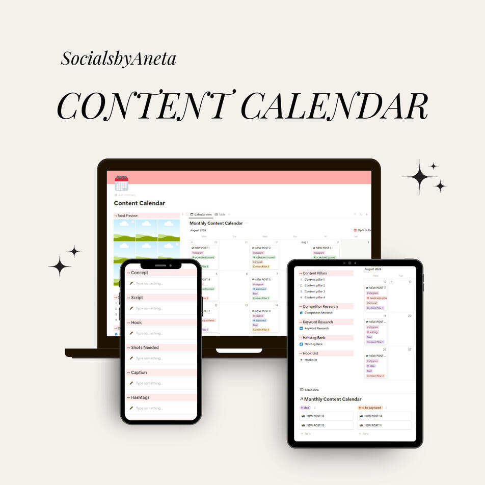 Are you struggling to post consistently on social media? Or do you often run out of content ideas?Consistency is KEY on social media, without consistency you will not be able to grow and create a community.In this personalized Notion content calendar, you'll get a 1-month of content planned according to your business goals.This calendar can be created for Instagram and TikTok.Click this LINK for getting the Calendar!